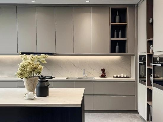 This space-saving L-shaped kitchen cabinets in a modern gray finish is designed for efficiency and style. It provides abundant storage alongside practical open shelving for quick access to everyday cooking essentials. The included white quartz island not only adds a sleek counterpoint but also serves as a convenient and quick dining area for the family, making it the perfect heart of a busy home.
