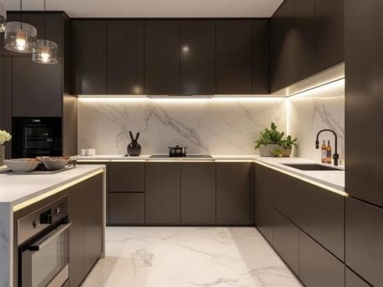 This is a high-end grey Italian modern kitchen cabinet with a flat design, simple and elegant, clean and tidy. It is embedded with LED light strips, allowing you to feel warmth and romance even when cooking.